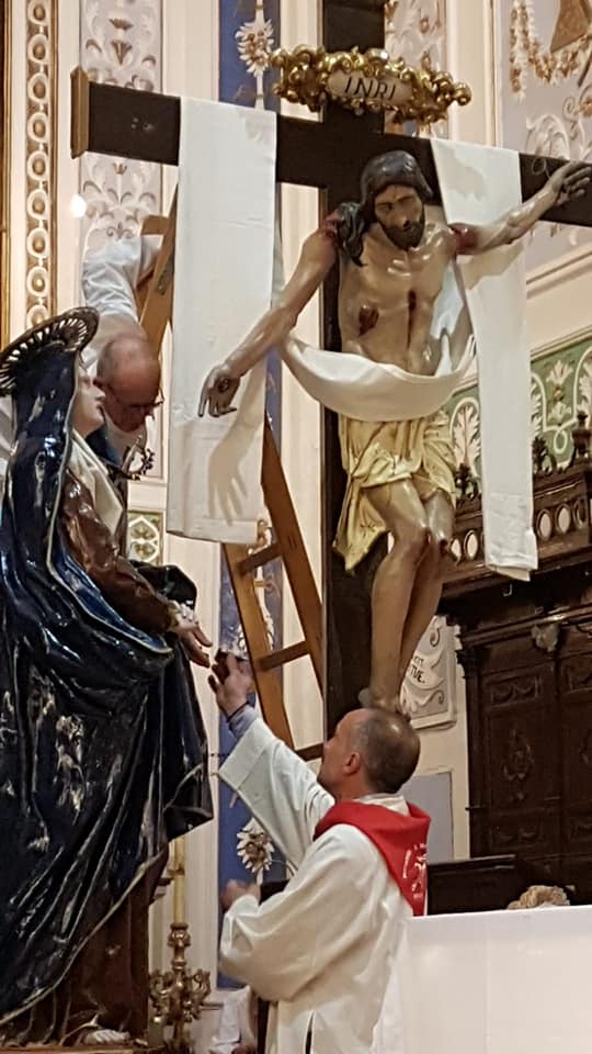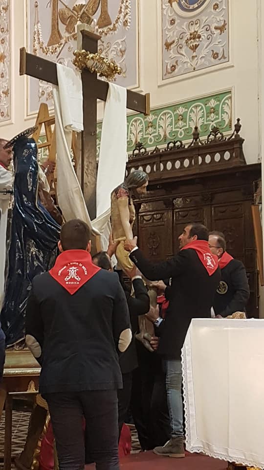 Un silenzio carico di suggestione ha scandito, nella chiesa di Santa Maria di Betlem, a Modica, i momenti più significativi del tradizionale rito della “Deposizione del Cristo dalla Croce”. E’ un rito molto particolare che, facendo seguito alla domenica delle palme e della Passione del Signore, ha dato il via di fatto alla Settimana santa 2019. Dopo la santa messa celebrata dal parroco, il sacerdote Antonio Maria Forgione, è stato il sacerdote Ignazio La China, parroco di San Giuseppe e vicario foraneo di Scicli, a guidare questa speciale fase. Il simulacro del Cristo viene calato dalla Croce, dopo che, uno dopo l’altro, sono staccati i tre chiodi (i due delle mani, l’altro collocato ai piedi). Prima, però, viene tolta la corona di spine. Subito dopo, il corpo, appena deposto, viene trasportato su una lettiga all’interno della cappella palatina e qui disposto per l’adorazione dei fedeli, accanto al simulacro della Madonna Addolorata. Il tutto, in un contesto architettonico unico, quale quello della cappella Cabrera, sopravvissuta al terremoto del 1693 e incastonata nella nuova architettura settecentesca.