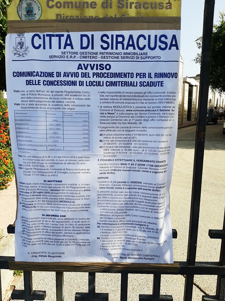 Sono, infine, in fase di controllo le concessioni dei loculi in zona cimitero Monumentale rilasciate tra il 1959 e il 1975. E’ possibile effettuare il versamento tramite: bonifico bancario IBAN IT 84 Z 02008 17108 000300120054 intestato al Comune di Siracusa oppure con bollettino di c/c postale n. 10582936.
