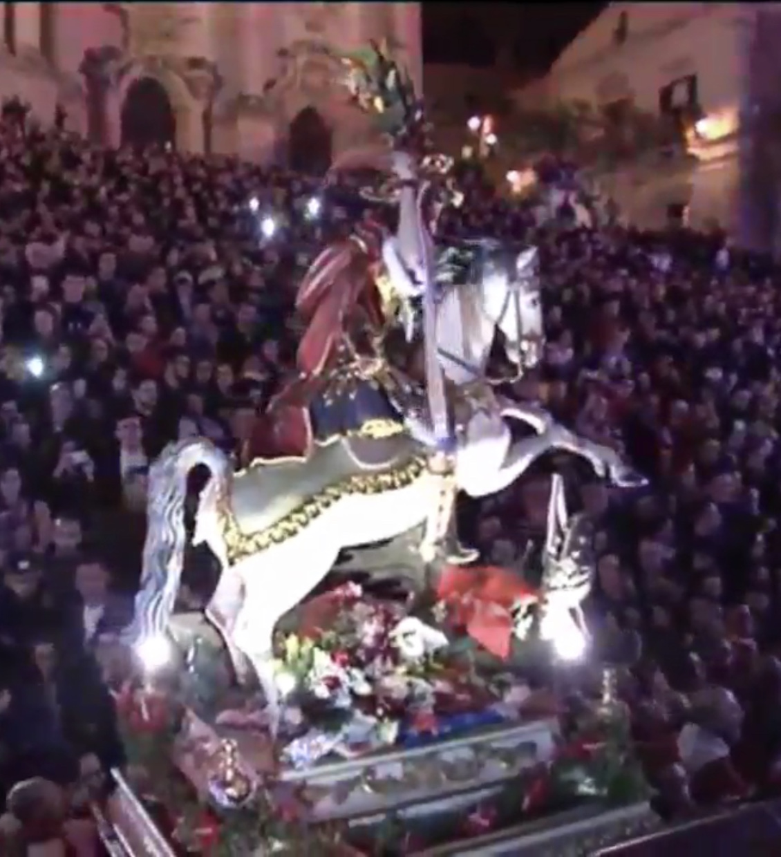 A Modica una dimostrazione d’affetto senza eguali da parte di migliaia di fedeli e devoti che, assieme a turisti e visitatori, hanno formato un tappeto umano a partire dal pomeriggio, quando il simulacro di San Giorgio è uscito dal Duomo, intorno alle 17, per iniziare la lunga processione, terminata poco dopo la mezzanotte, quando il santo cavaliere è rientrato e ha dato inizio ai memorabili “gira” all’interno delle navate della chiesa Madre di Modica al tradizionale grido di “Giorgio, Giorgio, Giorgio” da parte di portatori e devoti e dopo lo sparo di volantini e fuochi pirotecnici. La processione ha vissuto straordinari momenti di intensità ogni qualvolta il simulacro si è fermato in prossimità delle abitazioni di persone anziane o che non possono camminare. Al passaggio della processione presso l’ex foro boario di via Fontana, un altro spettacolo pirotecnico a cui ha fatto seguito la “Calata dell’Angelo”, omaggio al santo accompagnato da fuochi e musica a cura della Angel’s Entertainment di Flavio Pulvirenti.