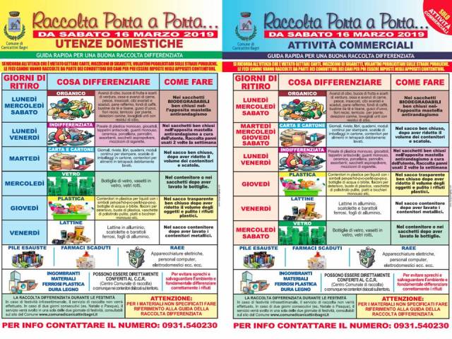 Questi gli orari di conferimento presso l’Isola Ecologica – CCR: aperta dal Lunedì al Sabato dalle ore 09:30 alle 12:30, con esclusione del Martedì aperta nel pomeriggio dalle ore 15:00 alle ore 18:00. I cittadini dovranno recarvisi muniti di Tessera Sanitaria personale, dov’è riportato il codice fiscale, che servirà a registrare i quantitativi di conferimenti sul proprio conto. Possono essere portati, già separati secondo la categoria di appartenenza, ad esclusione dell’umido e dell’indifferenziato, i seguenti rifiuti e materiali: plastica, carta, cartone, vetro, lattine, oli e grassi, pile e batterie, farmaci, ingombranti multi materiali, legno, metallo e imballaggi vari.