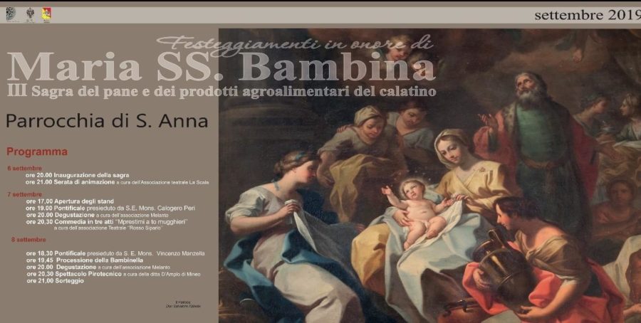 Nutrito il programma di appuntamenti in occasione dei festeggiamenti in onore di Maria Santissima Bambina, che si svolgeranno da venerdì 6 a domenica 8 settembre nella parrocchia di Sant’Anna (retta da don Salvatore Abbotto), col patrocinio del Comune di Caltagirone. Il programma: venerdì 6, alle 20, inaugurazione della III Sagra del pane e dei prodotti agroalimentari del Calatino; alle 21, sul sagrato della chiesa, serata musicale a cura dell’associazione “La Scala” con il concerto “Emozioni” di Giusy Rinaudo – pianoforte e fisarmonica Gaetano Di Stefano, chitarre Emanuele Bunetto, ballerini Claudio Licciardi e Sara Sales, presenta Maria Luisa Cannilla, direzione artistica di Giovanni Canfailla.