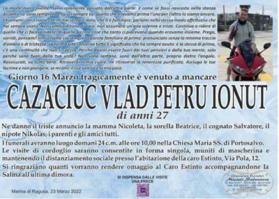 Marina di Ragusa – domani l’ultimo saluto a Vlad Cazaciuc