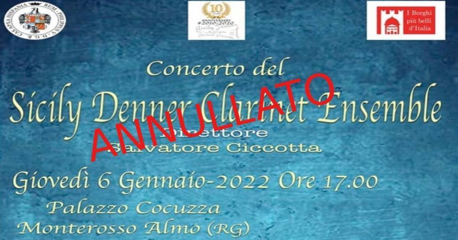 Rimandato a data da destinarsi il concerto del Sicily Denner Clarinet Ensemble, che si sarebbe dovuto svolgere domani 6 gennaio a Monterosso Almo, in uno dei saloni di Palazzo Cocuzza. Considerato l’aumento dei casi di contagio di Covid-19, nonché la provenienza dei musicisti da diverse località della Sicilia, per prudenza l’Amministrazione comunale ha annunciato la volontà di annullare l’evento musicale e posticiparlo a data da destinarsi.