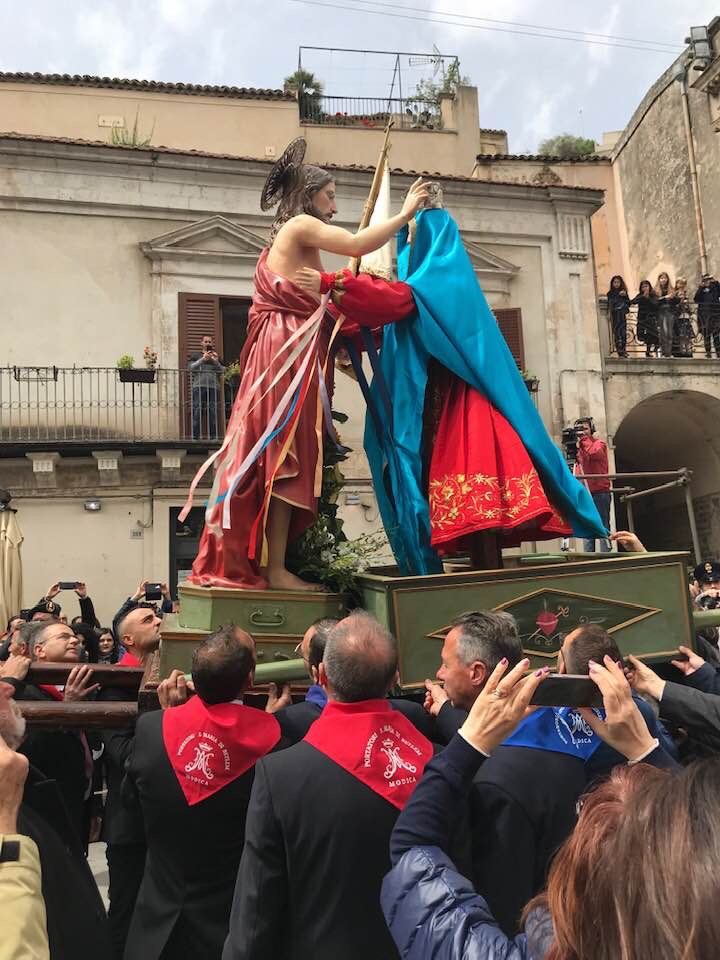 Il vento e l’allerta meteo, invece, non hanno rovinato un’altra delle feste caratterizzanti la Pasqua negli Iblei, ossia la Madonna Vasa Vasa di Modica, che va in archivio con un’altra edizione davvero straordinaria con numeri incredibili sia la mattina che nel corso dell’incontro serale, giunto al quarto anno. Otto i “baci”, cinque la mattina e tre in serata, che hanno scandito uno degli eventi più suggestivi della Pasqua ragusana, ma il più atteso resta il primo, a mezzogiorno in punto, in piazza Monumento, proprio di fronte al Municipio, tra una moltitudine di persone. Maria, come da tradizione, si è liberata del manto nero, portato in segno di lutto per la morte del Figlio, lasciando librare in cielo alcune colombe bianche mentre i fedeli hanno applaudito con trasporto. Il Cristo risorto si è avvicinato alla Madre e quest’ultima ha dato vita al cosiddetto “bacio”, un modo per esprimere la gioia della Resurrezione. Turisti provenienti da ogni dove hanno fatto da cornice a questo splendido momento. I riti pasquali avevano preso il via già di buon mattino. Alle 8,45, da Santa Maria di Betlem, per il sesto anno consecutivo, il simulacro della Madonna bardato a lutto aveva percorso le viuzze situate nella zona a monte della chiesa. Alle 10 era cominciata la solenne celebrazione eucaristica tenuta dal parroco don Antonio Maria Forgione. Intorno alle 11, in due tempi diversi, i simulacri sono usciti, dopo la messa solenne, dalla chiesa di Santa Maria di Betlem. Mentre il Cristo risorto ha seguito l’itinerario delle strade principali, il corteo con la Madonna bardata a lutto si è mosso, preceduto da un tamburino, lungo le viuzze più ricche di fascino del centro storico di Modica. A mezzogiorno l’incontro, il “bacio” e la benedizione alla folla. Gli altri due baci esterni mattutini dinanzi alla chiesa di San Pietro e dinanzi a Santa Maria di Betlem prima del rientro dei due simulacri. In chiesa si sono tenuti altri due “baci”, uno al centro dell’edificio di culto, l’altro sull’altare.