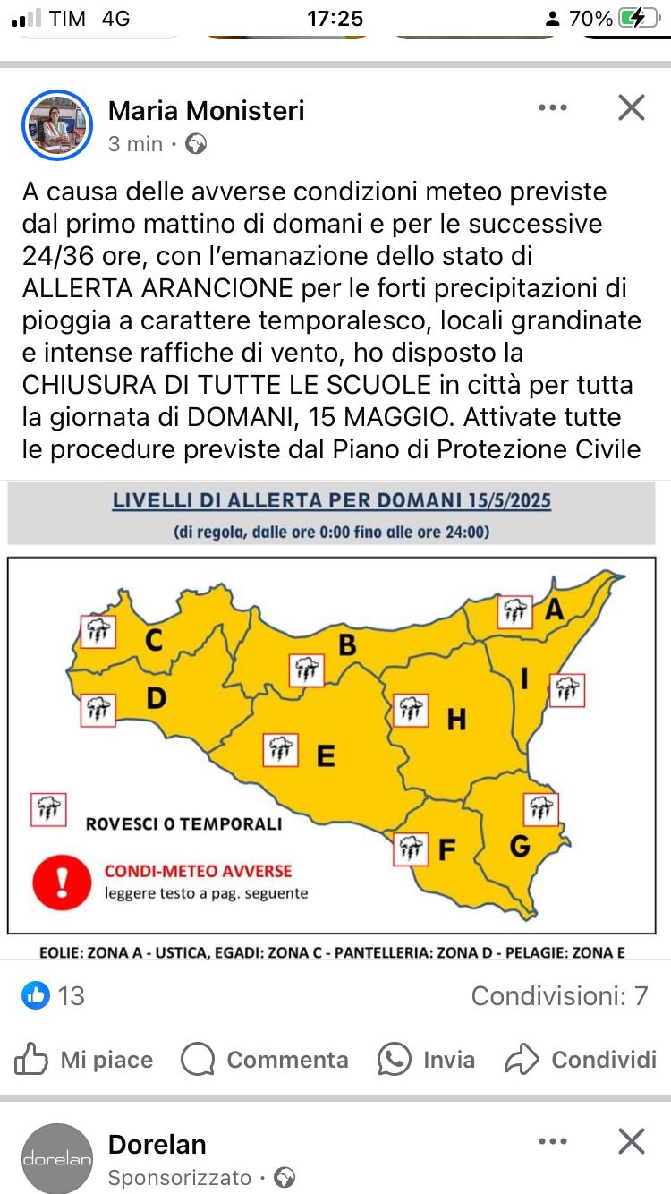 “A causa delle avverse condizioni meteo previste dal primo mattino di domani e per le successive 24/36 ore, con l’emanazione dello stato di ALLERTA ARANCIONE per le forti precipitazioni di pioggia a carattere temporalesco, locali grandinate e intense raffiche di vento, ho disposto la CHIUSURA DI TUTTE LE SCUOLE in città per tutta la giornata di DOMANI, 15 MAGGIO. Attivate tutte le procedure previste dal Piano di Protezione Civile.”– Maria Monisteri, Sindaco di Modica