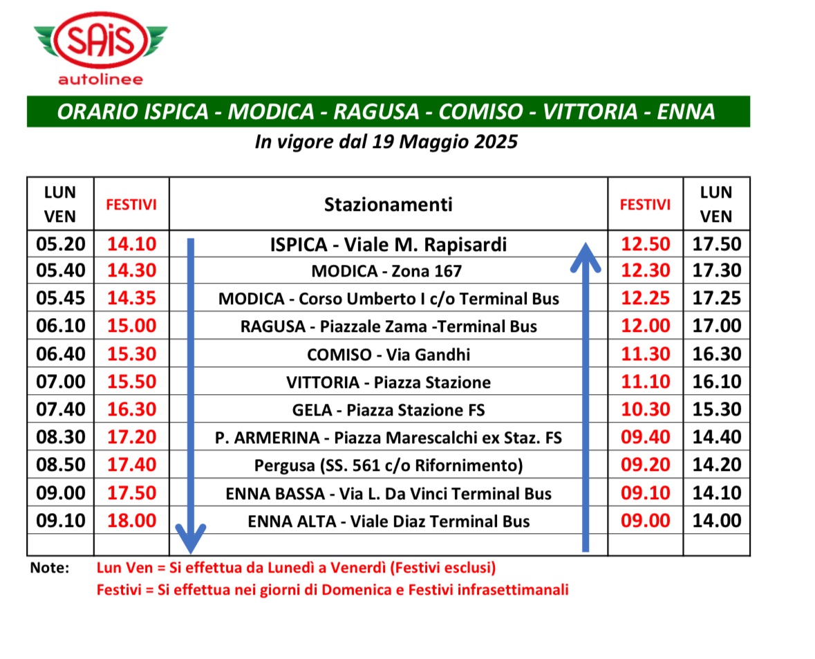Un’importante novità che interessa molto da vicino gli studenti universitari residenti in provincia di Ragusa ed iscritti all’Ateneo Kore di Enna. E’ l’attivazione da parte di SAIS di una ulteriore linea extraurbana che partirà da lunedi 19 maggio con cadenza giornaliera da Ispica per il capoluogo ennese. La corsa effettuerà fermate a Modica, Ragusa, Comiso e Vittoria. Prima di arrivare a Enna Bassa in via Leonardo da Vinci in prossimità diretta dell’Università degli Studi di Enna “Kore” ci saranno le fermate a Piazza Armerina e Pergusa. “Questa nuova tratta – commenta l’Onorevole Ignazio Abbate – rappresenta una risposta concreta alla crescente domanda di studenti universitari e lavoratori pendolari che ogni giorno necessitano di spostarsi tra le province di Ragusa ed Enna. La linea è particolarmente strategica per gli studenti universitari iblei, che potranno così raggiungere il campus in modo rapido, comodo ed economico, senza necessità di trasporto privato o cambi intermedi. Gli orari sono pensati per consentire l’arrivo a Enna in tempo utile per le lezioni mattutine e pomeridiane, offrendo anche una fascia di ritorno compatibile con il termine delle attività accademiche. Ringrazio per la disponibilità ad accogliere le richieste degli studenti i vertici di SAIS Autolinee e lavoreremo nelle prossime settimane anche alla possibilità di poter avere ulteriori linee per Palermo”.