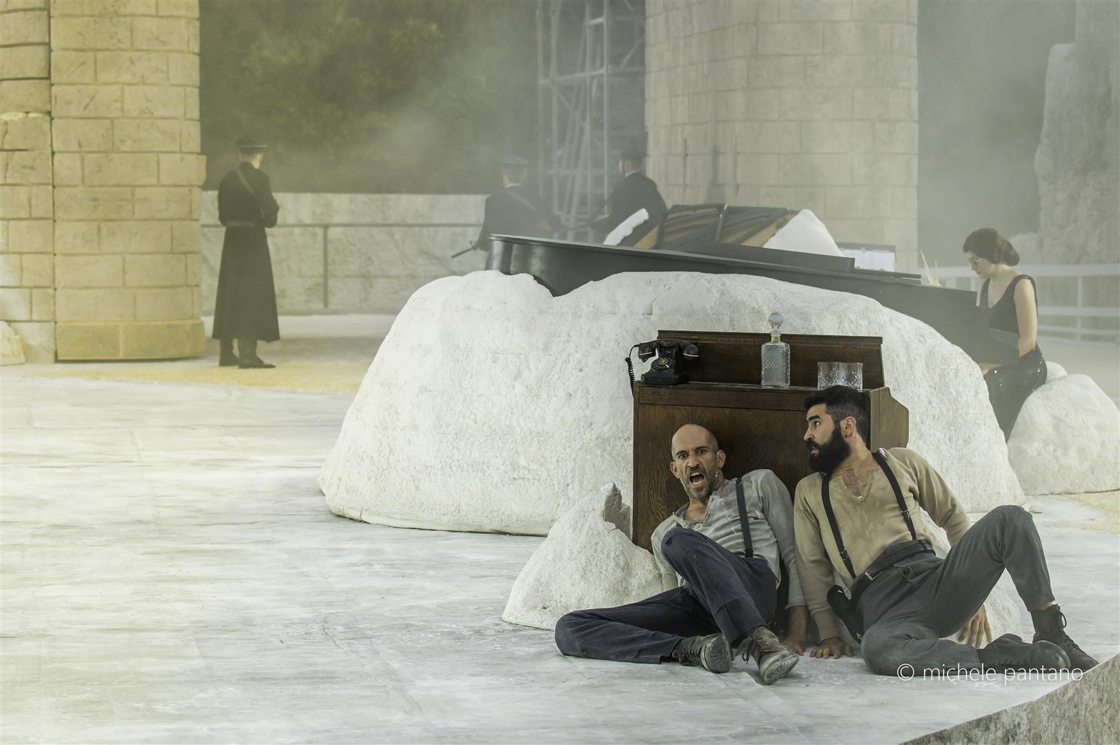Nel cast, Laura Marinoni (Clitennestra), Giuseppe Sartori (Oreste), Anna Della Rosa (Elettra) Stefano Santospago (Egisto), Giancarlo Judica Cordiglia (Apollo), Olivia Manescalchi (Atena), Maria Grazia Solano (Cilissa e la Pizia), Gaia Aprea, Alice Giroldini, Valentina Virando, Chiara Osella, Graziana Palazzo e Silvia Piccollo (Le Coefore), Maria Laila Fernandez, Marcello Gravina e Turi Moricca (Erinni/Eumenidi), i musici Diego Mingolla e Stefania Visalli, Spyros Chamilos (Pilade), Irasema Carpinteri (una donna), Gabriele Crisafulli, Manfredi Gimigliano, Lorenzo Iacuzio, Roberto Marra e Francesca Piccolo (guardie), Federica Cinque (statua di Atena). Coefore Eumenidi resterà in scena fino al 31 luglio.