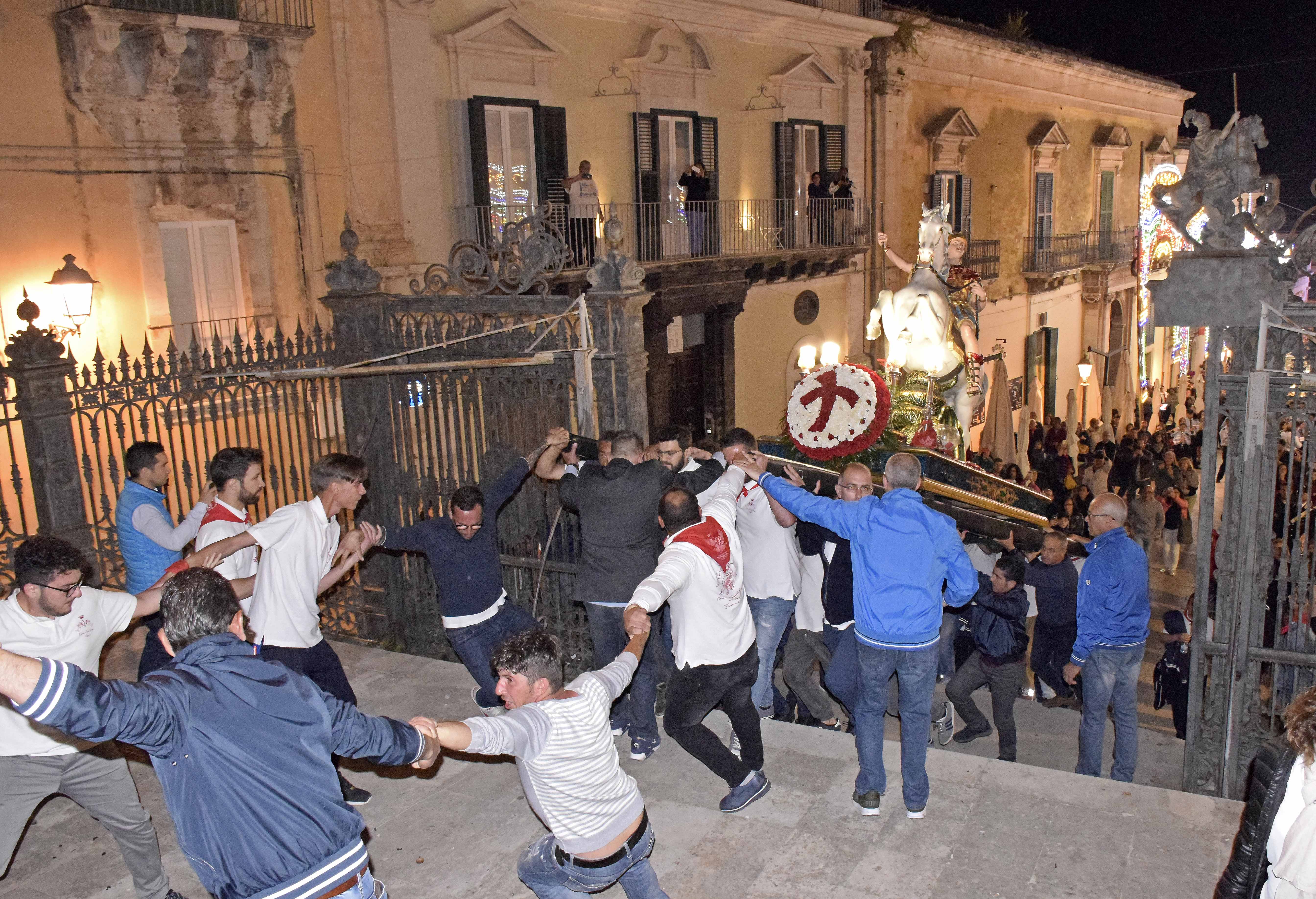 Tra i momenti più suggestivi, la sosta alla chiesa delle Anime sante del Purgatorio, caratterizzata dalla recita dei Vespri. Lungo tutto il tracciato della processione, numerosi i fedeli che, dai balconi delle proprie abitazioni, soprattutto in corso XXV Aprile ma anche altrove, hanno omaggiato il santo martire, come tradizione vuole, con il lancio di petali di rosa. “Le decine di migliaia di presenze che è stato possibile registrare nel corso di questa settimana, e soprattutto nella giornata di sabato e di ieri – dicono i componenti del comitato dei festeggiamenti – testimoniano come la tradizione celebrativa dedicata al santo cavaliere continui a riscuotere grande interesse da parte di fedeli e visitatori. Dobbiamo ringraziare tutti coloro che ci hanno sostenuto, dagli enti pubblici e privati, il presidente del collegio dei deputati questori della Regione, on. Giorgio Assenza, e ancora da Ibla classica international, con il suo direttore artistico Giovanni Cultrera, alle forze dell’ordine, ai circoli cattolici, ricreativi e culturali di Ibla oltre ad Anbima Sicilia. Senza dimenticare tutti i cittadini che, con le loro offerte, hanno contribuito alla buona riuscita della festa. Tra i ringraziamenti anche quelli nei confronti di chi ha curato la splendida illuminazione artistica per le vie di Ibla, vale a dire Novarlux Luminarie di Novara di Sicilia, e la ditta Tumore srl di San Filippo del Mela per i fuochi pirotecnici. E ancora la ditta F.lli Vaccalluzzo di Belpasso per i fuochi piromusicali oltre a Elisa Nieli per il mapping. Grazie anche ai corpi bandistici San Giorgio Città di Ragusa e Vito Cutello di Chiaramonte Gulfi e alla ditta Promo Service per l’illuminazione artistica del Duomo”. L’estrazione della lotteria locale si terrà sabato 8 giugno alle 20 nella sagrestia del Duomo.