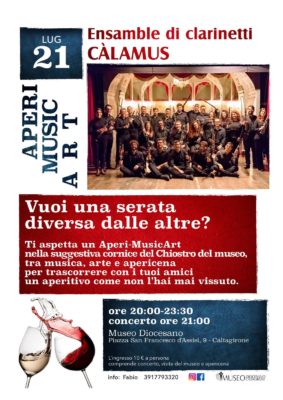 Domani, invece, dalle 20 alle 23,30, nella suggestiva cornice del Chiostro del Museo diocesano di Caltagirone, si svolgerà l’Aperi-MusicArt: una serata da trascorrere tra musica, arte e apericena. Nel contesto della serata, alle 21 si terrà il concerto dell’ensemble di clarinetti “Calamus”, formato da clarinettisti siciliani. Da qualche anno l’ensemble porta avanti un progetto legato alla musica popolare. All’interno di questo progetto vengono proposti repertori con arrangiamenti di musiche legate a varie tradizioni del sud Italia ed europee, con l’utilizzo di strumenti come la gaita galiziana, il friscaletto siciliano, la chitarra battente calabrese e la zampogna lucana. Ingresso a pagamento.