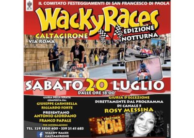 Ricco week end di eventi a Caltagirone. Si comincia stasera, a partire dalle 18, lungo la via Roma, dove, su iniziativa del Comitato festeggiamenti di San Francesco di Paola, si terrà l’edizione notturna del “Wacky Races Show”, corsa di automobili a spinta, vale a dire interamente costruite senza motore, ma dotate di freni. In giuria, composta anche da Giuseppe Carnibella e Riccardo Forte, la nota “performer” Rosy Messina.