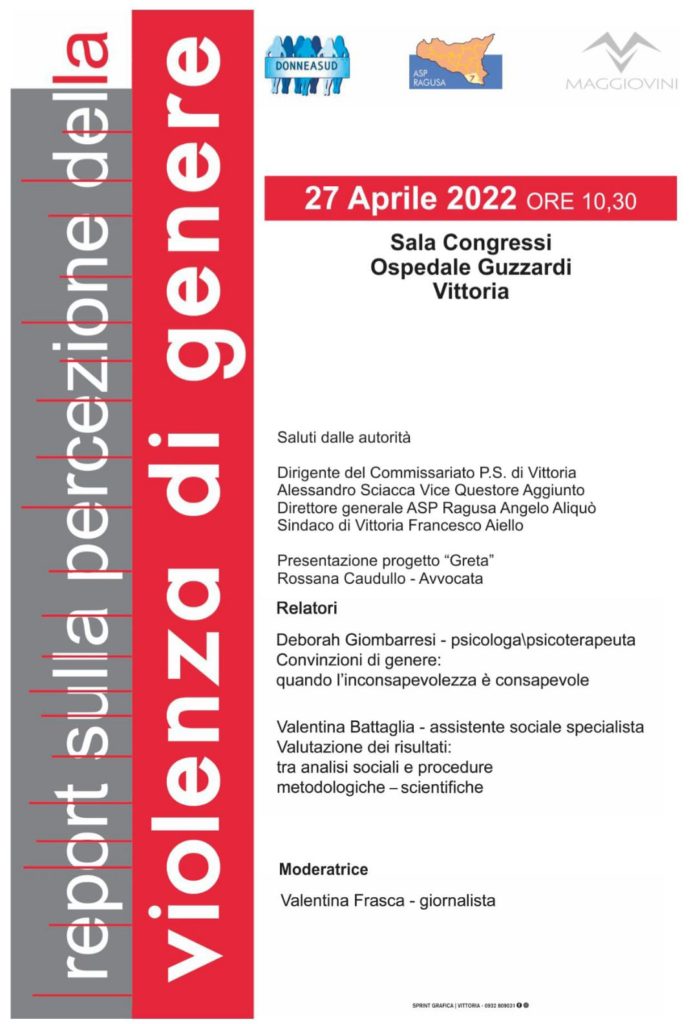 Domani, mercoledì 27 aprile 2022 alle ore 10.30, nella sala congressi dell’ospedale Guzzardi di Vittoria, ASP di Ragusa e associazione Donne a Sud presenteranno i risultati del progetto “Greta”, frutto di una ricerca nata dall’esigenza delle operatrici del centro antiviolenza di Donne a Sud di rilevare la diffusione del fenomeno della violenza di genere perpetrata nei confronti delle donne del territorio ipparino, e vittoriese nello specifico.