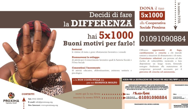 La cooperativa Proxima Ragusa ha avviato una campagna per sensibilizzare chi deve ancora presentare la propria dichiarazione dei redditi a donare il 5×1000 a sostegno dei progetti rivolti alle vittime di tratta e grave sfruttamento sessuale e lavorativo. “E’ una buona occasione – sottolinea la presidente di Proxima, Ivana Tumino – per decidere di fare la differenza, a maggior ragione in una stagione storica in cui si rischiano di perdere di vista quelli che sono i veri valori. Il nostro slogan è molto semplice ed è rivolto a chi intende garantire un’opportunità di fuga, cambiamento e crescita a quanti intendono sottrarsi a situazioni di sfruttamento e di tratta. Da sempre, costruiamo relazioni con persone ad alto rischio di vulnerabilità, mettendo a loro disposizione un luogo sicuro, fornendo sostegno finalizzato alla maturazione di competenze personali, necessarie per il percorso di crescita ed autonomia”.