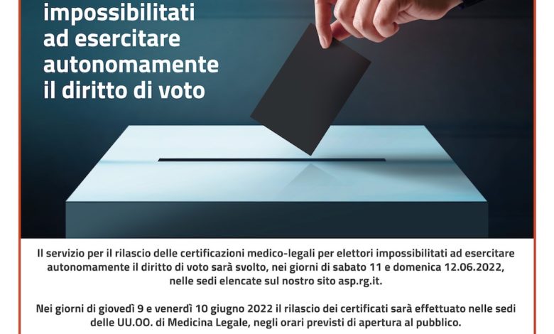 In provincia di Ragusa il rilascio delle certificazioni per elettori impossibilitati sarà svolto sabato 11 e domenica 12 giugno