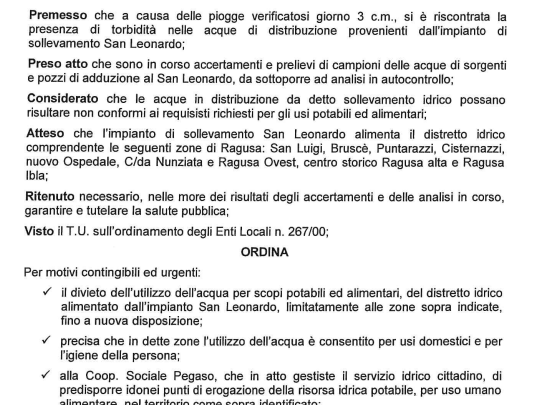 “Ho firmato l’ordinanza che sancisce la potabilità delle acque in distribuzione dall’acquedotto San Leonardo. Le ultime analisi dell’Asp - dice…