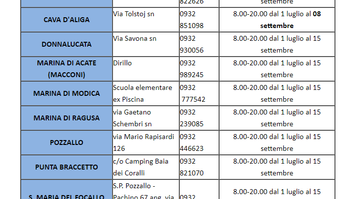 Continua »Garantiranno assistenza tutti i giorni dalle 8.00 alle 20.00 nelle località balneari di Cava D’Aliga, Donnalucata, Pozzallo, Scoglitti, Marina di…
